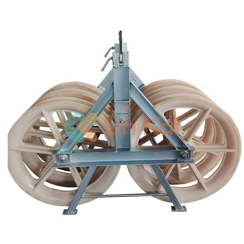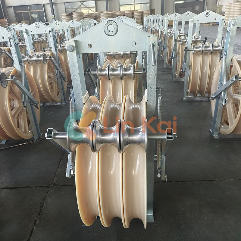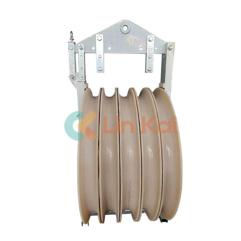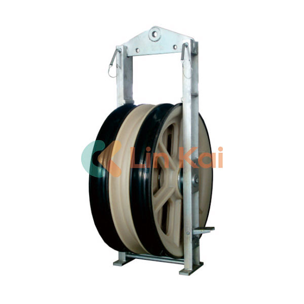 Blocos de amarração de grande diâmetro de 822 mm feitos na China pela fabricação de Ningbo Linkai são usados para linhas de energia aéreas de 800KV - 1000KV. Todas as roldanas são montadas sobre rolamentos de esferas e a estrutura dos blocos é feita em aço galvanizado.